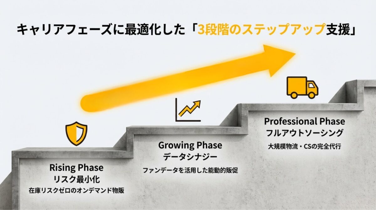 今回の事業承継によって、インディペンデントで活動するアーティストからトップアーティストまで、それぞれの活動ステージに最適化されたサポート体制が整備されます。具体的には、以下の3つのフェーズに分けた支援が展開される予定です。