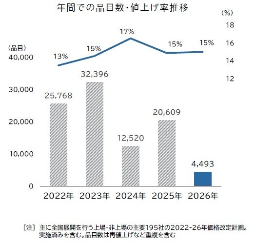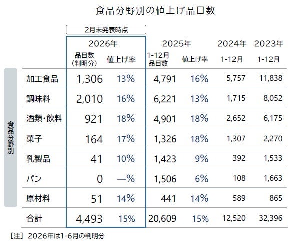 2026年における価格改定は、1月から6月までの累計で4,493品目となり、年間平均の改定率は15%に達しました。年間の価格改定予定品目が1万品目を超えていた前年同時期(2025年2月28日時点で10,797品目)と比較すると、2026年2月時点では予定を含めても5,000品目に届かず、前年比で約6割減のペースで推移しています。ただし、菓子類などでは「減量値上げ」が散見されるほか、価格改定する商品を選別する動きも見られます。また、コメの価格高騰を中心として、米菓などコメを原料とする飲食料品では値上げ圧力が根強く残っており、すり身やアフリカ豚熱の影響を受けた豚肉類など、関連する食料品では「原材料高」による影響を受けた価格改定が一部で見られました。ただし、全体としては総じて価格改定の動きが鈍化傾向にあり、単月で1,000品目を超えるのは6月までで4月のみ(2,516品目)にとどまりました。