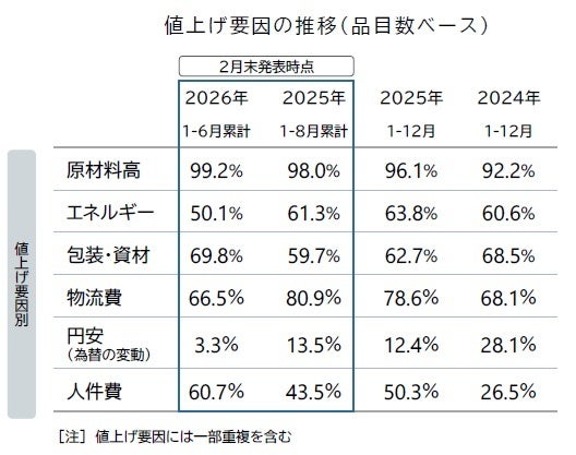 価格改定の要因を見ると、特に原材料などの物的要因による値上げが大部分を占めています。「原材料高」の影響を受けた価格改定は99.2%となり、集計を開始した2023年以降で最も高い水準となりました。国内だけでなく、海外市況の高騰を受けて価格改定に踏み切った商品が前年と比較して目立つ結果となっています。「包装・資材」は69.8%と約7割まで上昇し、2023年以降で最高水準となったほか、「人件費」に起因する値上げも60.7%と6割を超え、過去4年間で最高水準での推移となりました。一方で、トラックドライバーの時間外労働規制などが要因となった輸送コストの上昇分を価格に反映する「物流費」に起因する値上げは66.5%となり、前年通年の78.6%から大幅に低下しました。電気・ガス代などの「エネルギー」は50.1%、「円安(為替の変動)」は3.3%となり、いずれも前年を下回り、過去4年間で最も低い水準となりました。