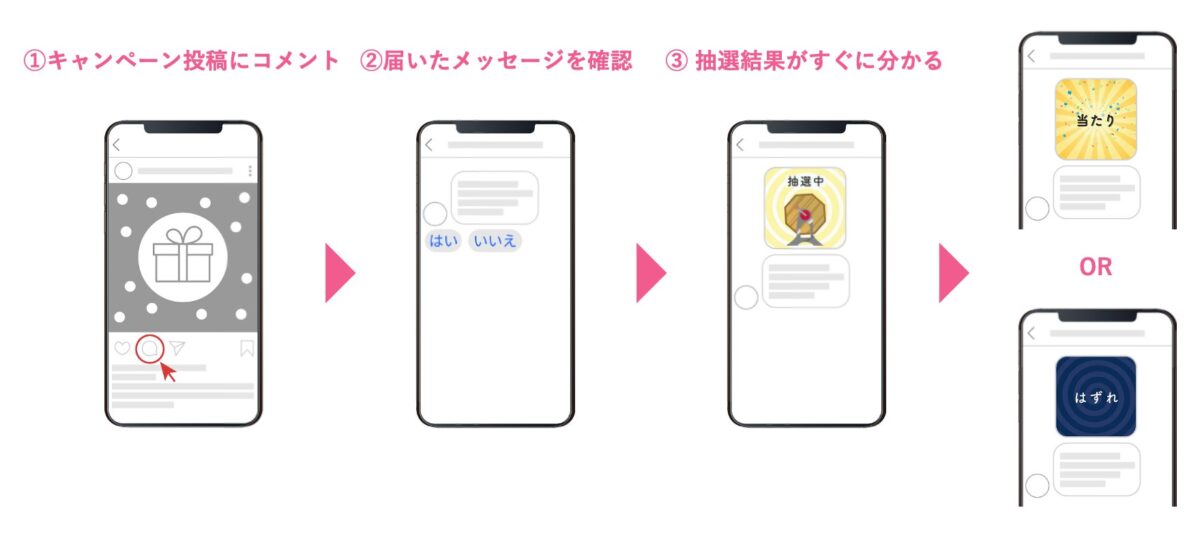 InstagramのDM機能を活用することで、キャンペーンの当選または落選を即座に通知するInstagramインスタントウィンキャンペーンは、応募直後に抽選結果を確認できる手軽さが特徴です。ユーザーにとっては気軽に参加しやすく、企業側にとってもDMを通じたユーザーとのコミュニケーションが可能になるため、エンゲージメント向上が期待できるキャンペーン手法として注目されています。