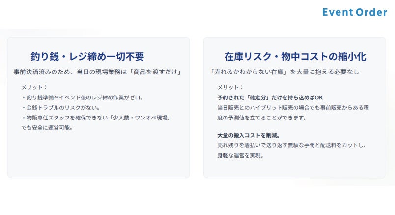 イベントの規模を問わず、すべてのイベント主催者の収益向上と、ファンにとっての「並ばずに快適な体験」を支えるインフラとして、サービスを拡大していくとしています。