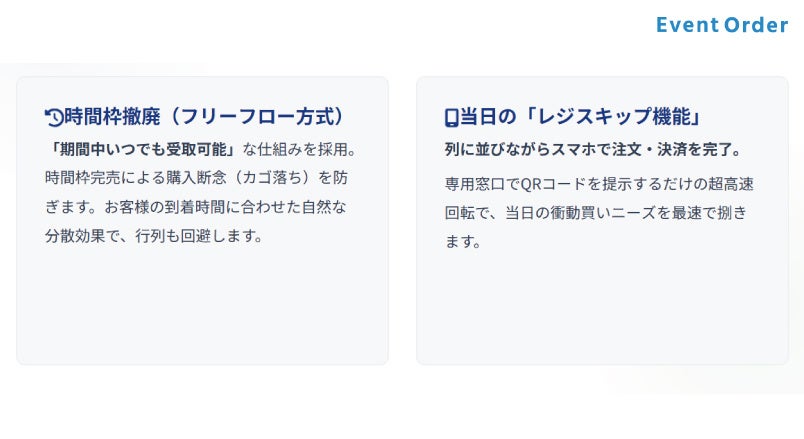 「レジスキップ機能」や、購入者のスマートフォンで作成する「デジタル注文票」を組み合わせることで、当日の口頭注文によるミスを防止し、決済時間を大幅に短縮します。