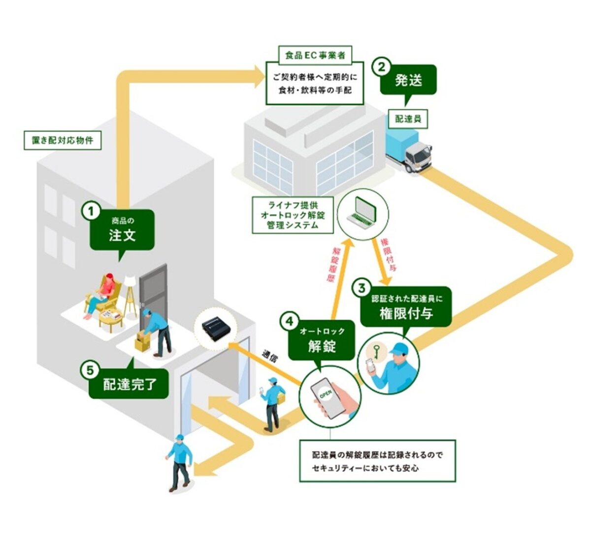セキュリティ面においては、解錠履歴が全て記録されることで、いつ誰がエントランスを解錠したのかが明確になり、従来の置き配よりも安全性が高まっています。マンション住民にとっても、管理会社やオーナーにとっても、安心して利用できるシステムとなっています。