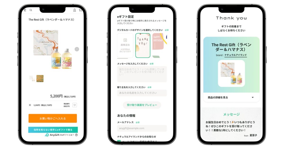 今回のAnyGift導入により、「ナチュラルアイランド公式通販」で販売されている一部の商品をeギフトとしてプレゼントすることが可能になります。
