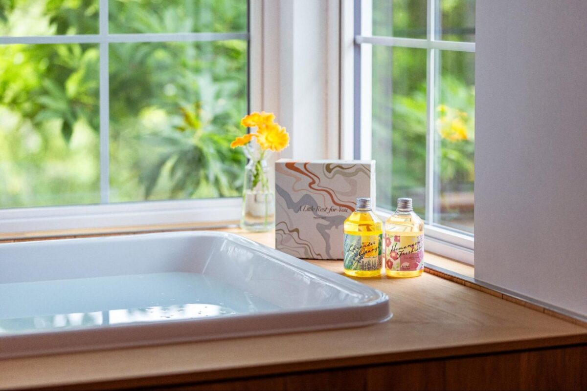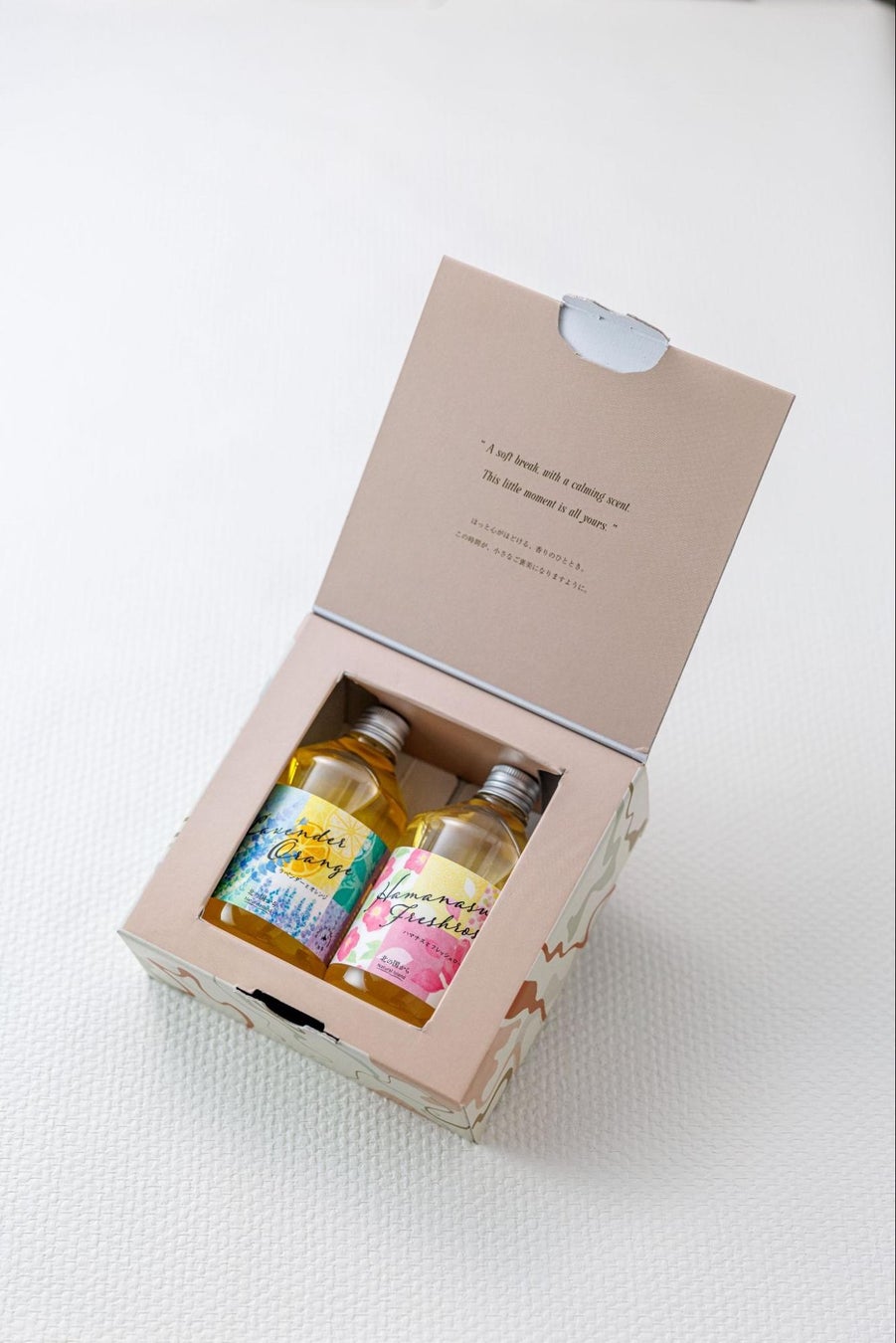 特別なギフトBOXに、アロマバスエッセンス2本(各300mL)を詰め合わせています。美容オイル配合で、お湯に溶かすとミルク色に乳化し、肌をやさしく包み込むようなしっとりした湯ざわりになります。北海道由来のアロマや植物由来成分を贅沢に使用し、深呼吸したくなるやわらかな香りが広がります。