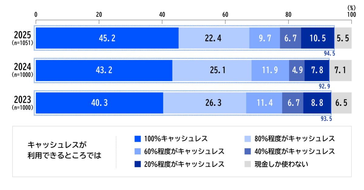 キャッシュレス決済利用者(キャッシュレスが利用できる場所では「100%キャッシュレス」から「20%程度がキャッシュレス」の合計)は94.5%に達し、着実な普及が確認されました。使える場所では「100%キャッシュレス」を利用する人は45.2%で、2023年調査の40.3%から上昇傾向が続いています。