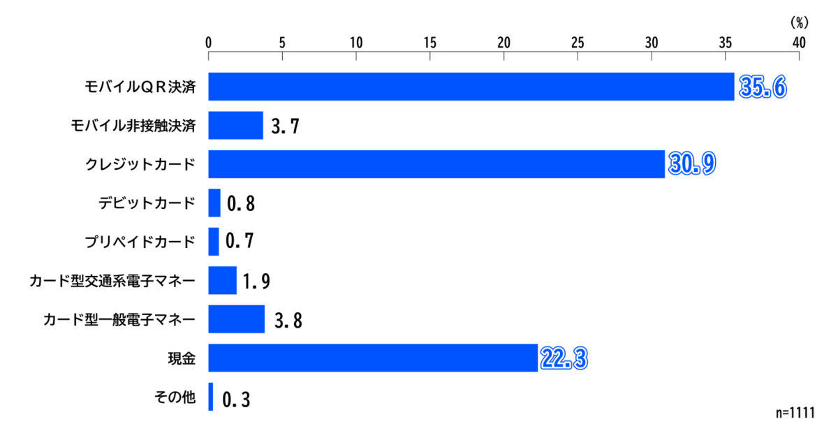 実店舗において最も利用頻度が高い決済手段は「モバイルQR決済」で35.6%、次いで「クレジットカード」が30.9%、「現金」が22.3%という順番になりました。