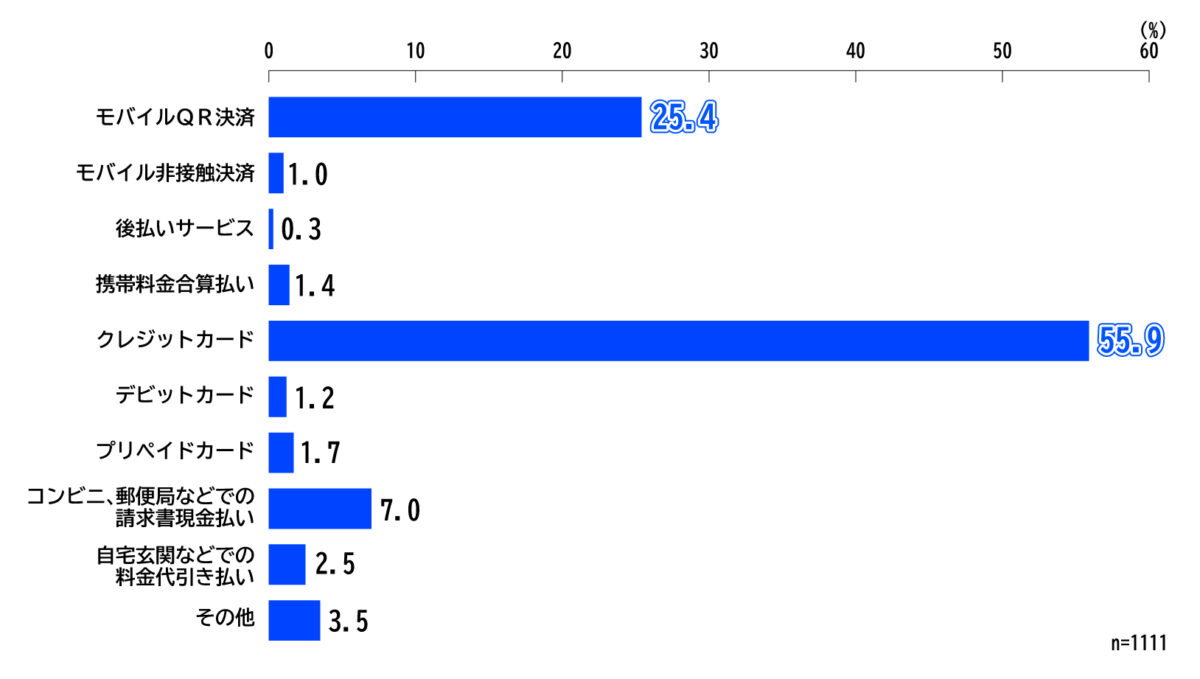 一方、オンラインにおいて最も利用頻度が高い決済手段は「クレジットカード」で55.9%と圧倒的です。次点の「モバイルQR決済」は25.4%で、その差は30.5ポイント、「コンビニ、郵便局などでの請求書現金払い」は7.0%で、その差は48.9ポイントと、クレジットカードが他の決済手段を大きく引き離していることが明らかになりました。