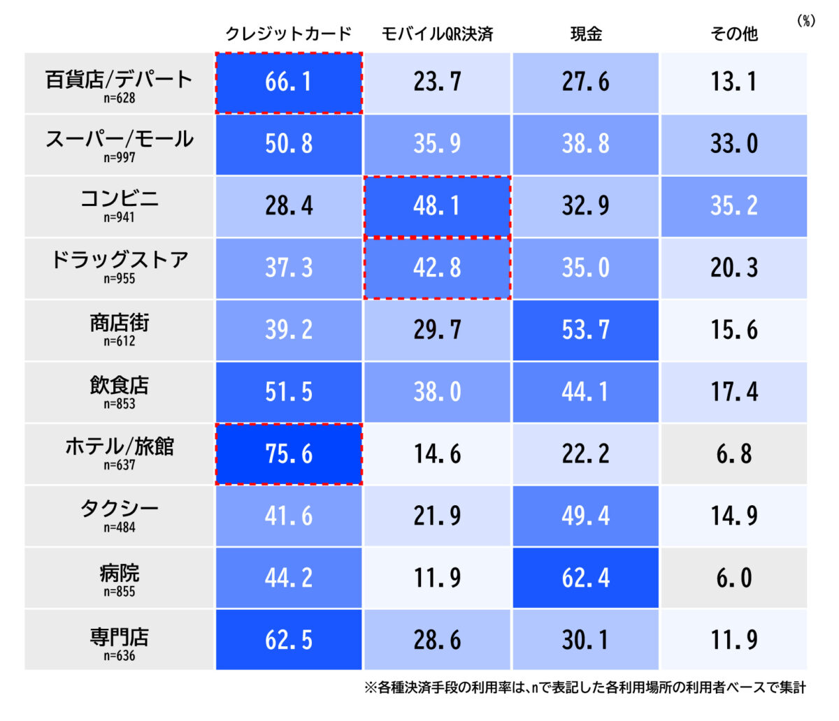 実店舗の利用場所別の決済手段を見ると、比較的高額な決済が行われる「百貨店/デパート」では66.1%、「ホテル/旅館」では75.6%が「クレジットカード」を利用しています。その一方で、日常の買い物など比較的少額な決済が行われる「コンビニ」では48.1%、「ドラッグストア」では42.8%が「モバイルQR決済」を利用しています。