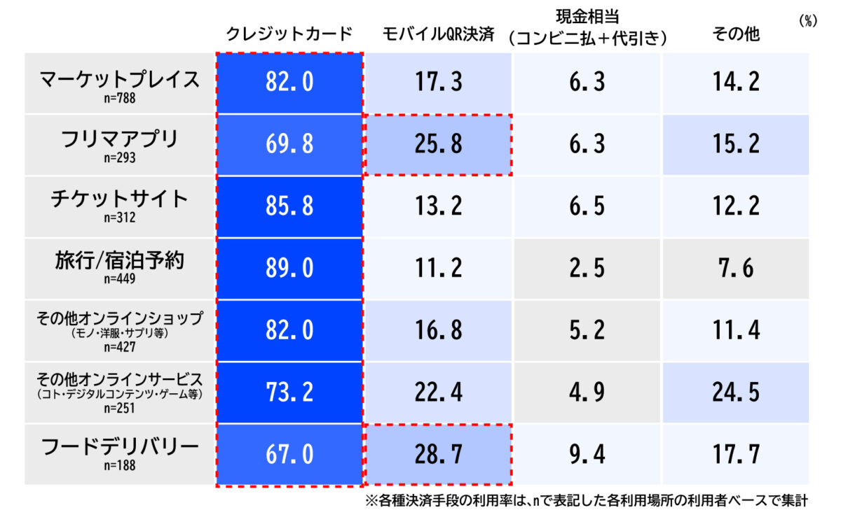 オンラインの利用場所別の決済手段については、全体的に「クレジットカード」の利用が主流となっている中、「フリマアプリ」では25.8%、「フードデリバリー」では28.7%など、一部のサービスにおいて「モバイルQR決済」が比較的高い利用率を示す結果となりました。
