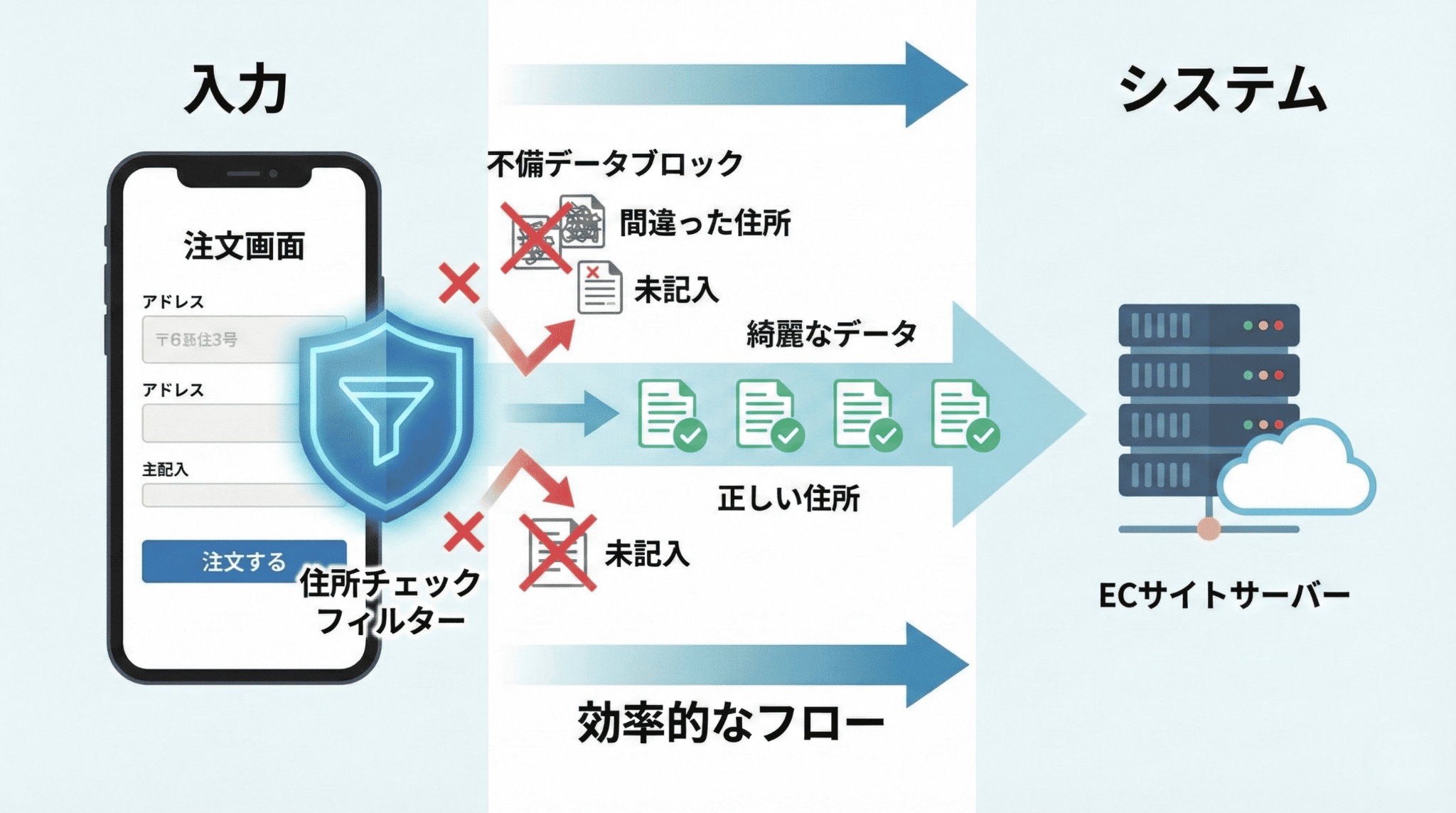 「入口対策」とは、お客様が購入手続き(チェックアウト)を行う画面で、入力内容をリアルタイムにチェックする手法です。最大のメリットは、「配送ソフト(ヤマトB2や佐川e飛伝など)が拒絶する注文」を、受注システムの中に1件も入れさせないことにあります。