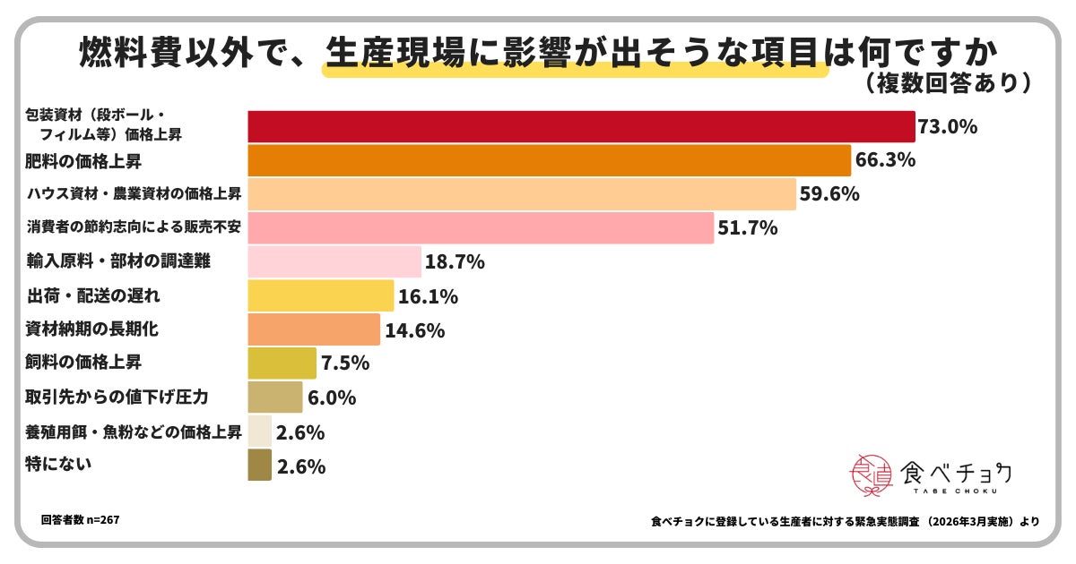 燃料費以外で、現時点で生産現場に影響が出そうだと感じている項目は、「梱包資材(段ボール、フィルム等)価格上昇」が73.0%、次いで「肥料の価格上昇」が66.3%、「ハウス資材、農業資材の価格上昇」が59.6%、「消費者の節約志向による販売不安」が51.7%となりました。