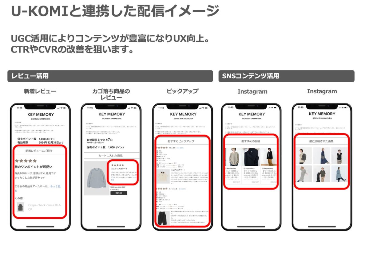 この連携を通じて、レビューの投稿有無や評価といったUGC情報を活用し、メール配信をはじめとするCRM施策においてレビューコンテンツを組み込むことができるようになります。