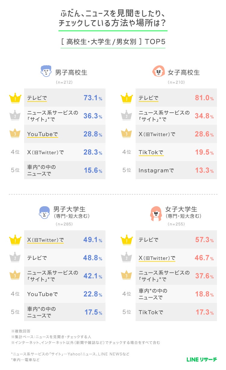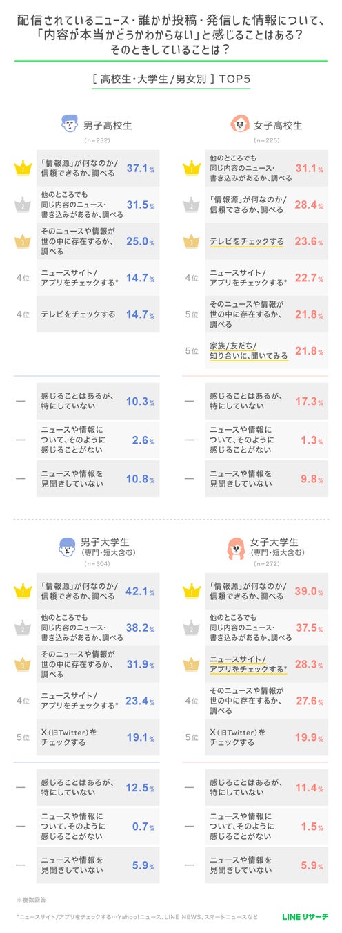 高校生の2位以降は男女とも「テレビをチェックする」「ニュース系サービスのサイト(Yahoo!ニュースやLINE NEWSなど)で調べる」「X(旧Twitter)で調べる」が続きます。