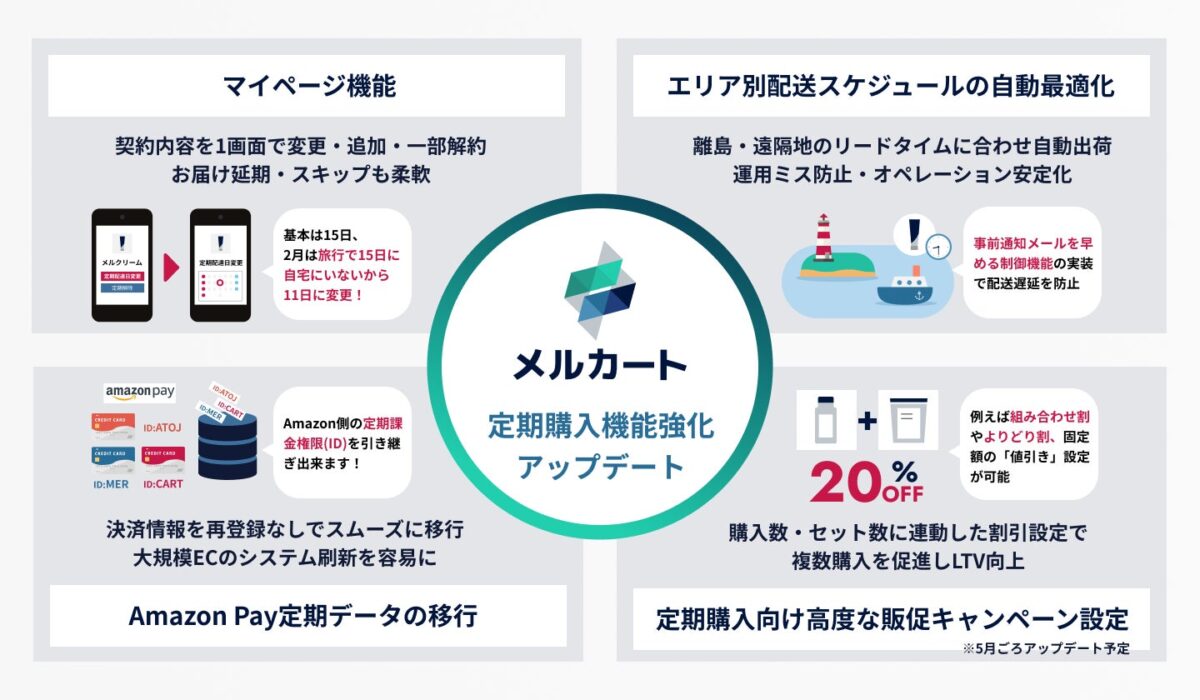 株式会社メルカートは、同社が提供するクラウドEC構築プラットフォーム「メルカート」において、定期購入(サブスクリプション)機能を大幅に強化するアップデートを実施することを発表しました。このアップデートでは、事業者の運用負荷を軽減する「配送リードタイムの自動最適化」機能や、顧客が自らマイページ上で契約内容を柔軟に変更できる新機能が実装されます。現場でのオペレーションミスを防ぎつつ、顧客満足度を向上させて解約を防止する、攻めのリピート戦略を支援する内容となっています。