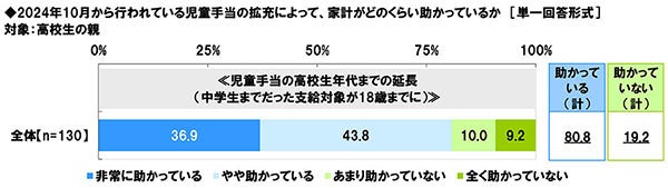 高校生の親に、児童手当の高校生年代までの延長によって家計がどのくらい助かっているかを聞いたところ、「助かっている(計)」は80.8%となっており、大多数が家計の負担軽減を実感しているようです。