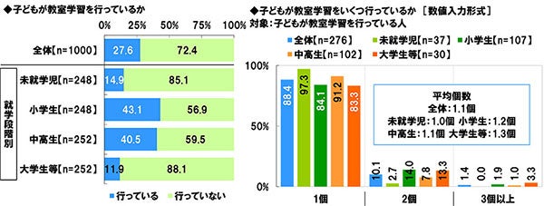 教室学習(学習塾、英会話、そろばん教室、プログラミング教室など)については、「行っている」が27.6%、「行っていない」が72.4%でした。就学段階別では、小学生が43.1%、中学生が40.5%といずれも4割以上となっています。教室学習を行っている子どもの平均個数は1.1個でした。