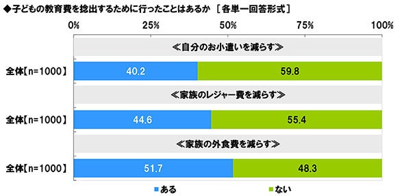 子どもの教育費を捻出するために、自分のお小遣いを減らしたことがあると回答した親は40.2%でした。また、家族のレジャー費を減らしたことがある親は44.6%、家族の外食費を減らしたことがある親は51.7%に上りました。