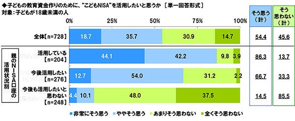 子どもが18歳未満の人に、子どもの教育資金作りのために「こどもNISA」を活用したいと思うかを聞いたところ、「非常にそう思う」が18.7%、「ややそう思う」が35.7%で、合計した「そう思う(計)」が54.4%となり、活用したいと考えている人が多数派となっています。