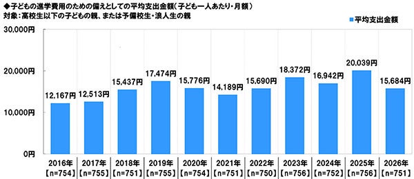 平均支出金額を過去の調査結果と比較すると、2025年の20,039円から2026年は15,684円となり、4,355円減少しました。学校外教育費だけでなく、進学費用の準備としての月々の支出金額も減少しており、物価上昇に伴う生活費の増加などにより、子どもの教育に関する出費にまわす余裕がないケースがあると考えられます。