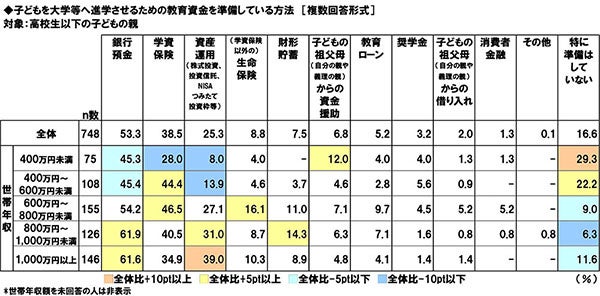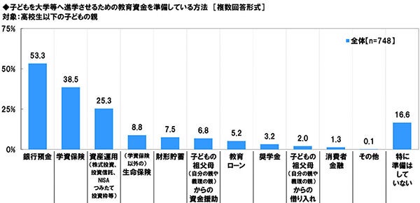 高校生以下の子どもの親に、大学等への進学のための教育資金をどのような方法で準備しているかを聞いたところ、「銀行預金」が53.3%で最も高く、「学資保険」が38.5%、「資産運用(株式投資、投資信託、NISAつみたて投資枠等)」が25.3%と続きました。