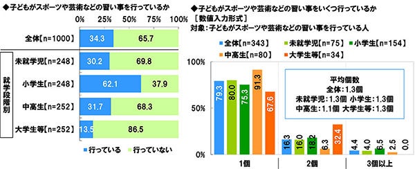 スポーツや芸術などの習い事を子どもが行っているかについては、「行っている」が34.3%、「行っていない」が65.7%でした。就学段階別では、小学生の親で「行っている」が62.1%と多数派となっています。習い事を行っている子どもの平均個数は1.3個でした。