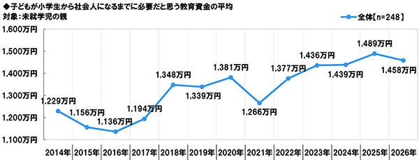 未就学児の親に対して、子どもが小学生から社会人になるまでに必要な教育資金の予想額を聞いたところ、平均は1,458万円となりました。「1,000万円~1,400万円位」が29.8%、「2,000万円~2,400万円位」が26.6%に回答が集まっています。