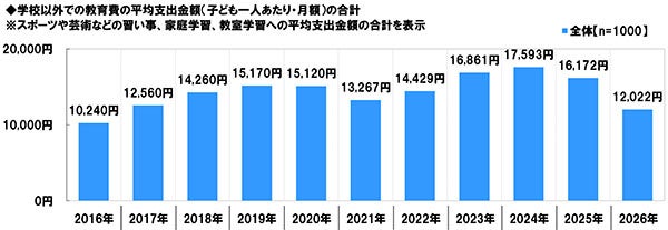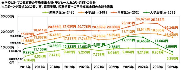昨年の調査結果と比較すると、すべての就学段階において減少しています。特に中高生の親では2025年の25,282円から2026年は19,348円/月となり、5,934円減少して、減少幅が最も大きくなりました。