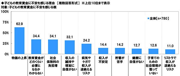不安を感じる理由として最も多かったのは「物価の上昇」で62.9%となり、2024年の調査から3年連続で1位となっています。物価高騰による生活費の増加で教育資金が不足することを心配している親が多いと考えられます。次いで「教育資金がどのくらい必要となるかわからない」が34.4%、「社会保険料の負担増」が34.1%、「収入の維持や増加に自信がない」が32.1%、「病気やケガで収入が途絶えるリスク」が24.2%と続きました。