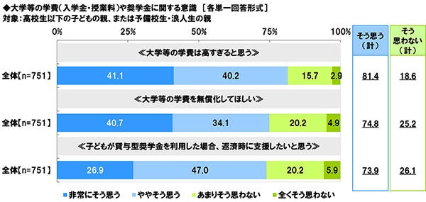 高校生以下の子どもの親、または予備校生・浪人生の親に、大学等の学費は高すぎると思うかを聞いたところ、「非常にそう思う」が41.1%、「ややそう思う」が40.2%で、合計した「そう思う(計)」は81.4%となりました。