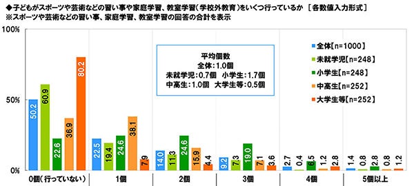 学校外教育をいくつ行っているかを聞いたところ、「0個(行っていない)」が50.2%と半数を占め、「1個」が22.5%、「2個」が14.0%となり、平均個数は1.0個となりました。就学段階別では、小学生が1.7個で最も多くなっています。