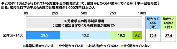 高校生以下の子どもの親で世帯年収が1,000万円以上の人に、2024年10月から行われている児童手当の所得制限撤廃によって家計がどのくらい助かっているかを聞いたところ、「非常に助かっている」が29.5%、「やや助かっている」が43.2%で、合計した「助かっている(計)」は72.6%となりました。