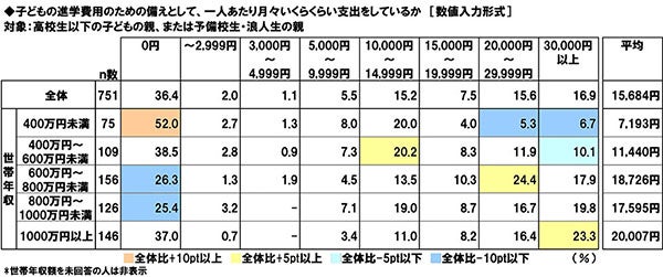 高校生以下の子どもの親、または予備校生・浪人生の親に、子どもの進学費用のための備えとして月々いくら支出しているかを聞いたところ、平均は15,684円/月となりました。「0円」が36.4%と最も多く、次いで「10,000円~14,999円」が15.2%、「20,000円~29,999円」が15.6%、「30,000円以上」が16.9%となっています。