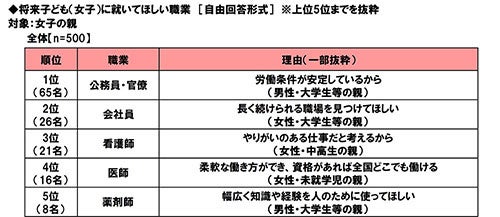 女子の親では、1位が「公務員・官僚」、2位が「会社員」、3位が「看護師」、4位が「医師」、5位が「薬剤師」となり、TOP2は男女ともに「公務員・官僚」と「会社員」となりました。選んだ理由として、1位の「公務員・官僚」については「労働条件が安定しているから」、2位「会社員」については「長く続けられる職場を見つけてほしい」、3位の「看護師」については「やりがいのある仕事だと考えるから」といった回答が挙げられました。