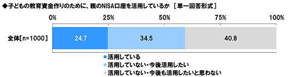 子どもの教育資金作りのために親のNISA口座を活用しているかを聞いたところ、「活用している」が24.7%、「活用していない・今後活用したい」が34.5%、「活用していない・今後も活用したいと思わない」が40.8%となりました。