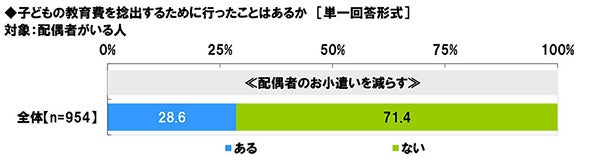 配偶者がいる人に対して、配偶者のお小遣いを減らしたことがあるかを聞いたところ、「ある」と回答した人は28.6%となりました。家族にかかる費用や自身のための支出を抑えて、子どもの教育費に充てようと考えている人が少なくないようです。