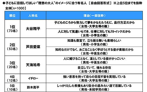 選んだ理由として、1位の「大谷翔平さん」については「子どものころから努力して夢をかなえたうえに、品行方正だから」や「人に対して気遣いもでき、仕事に対してもストイックだから」、2位の「芦田愛菜さん」については「知的なだけでなく、おごることなく学ぼうとする姿が素敵だから」、3位の「天海祐希さん」については「人に媚びることなく、凜としている姿がかっこいい」といった回答が挙げられました。