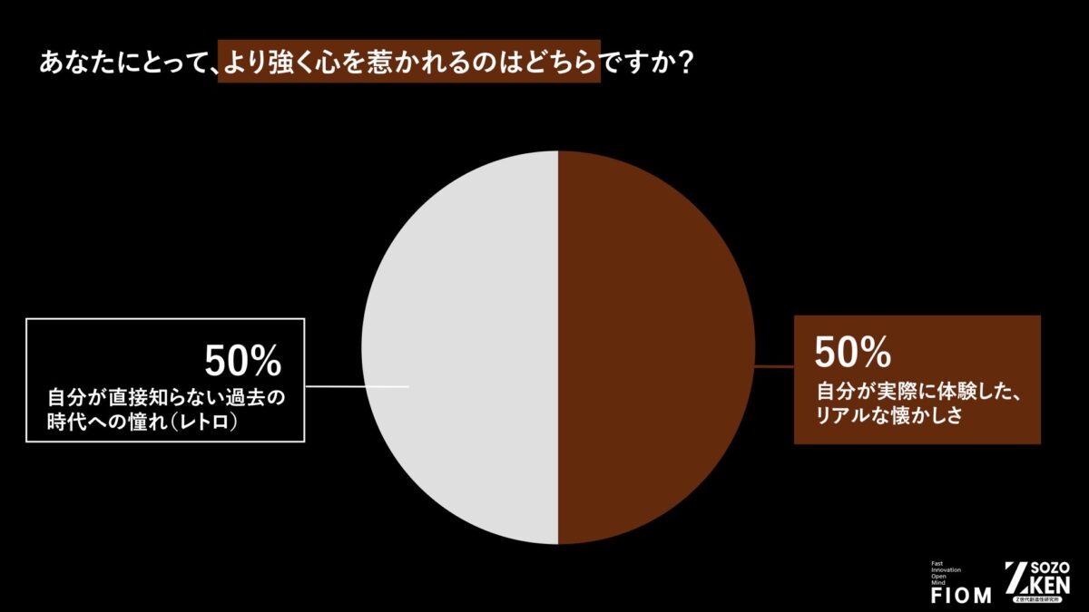 より強く心を惹かれるのは、自分が直接知らない過去への憧れ(レトロ)か、自分が体験したリアルな懐かしさかという問いに対しては、見事に50%ずつ票が割れました。しかし、タイムスリップできるならどちらに行きたいかという問いでは、「懐かしい時代に戻って、もう一度当時を体験したい」(57%)が、「過去の憧れのレトロな時代へ行って当時の空気を味わいたい」(43%)を上回り、自身のリアルな記憶の再体験への欲求がやや強い傾向にあることがわかります。