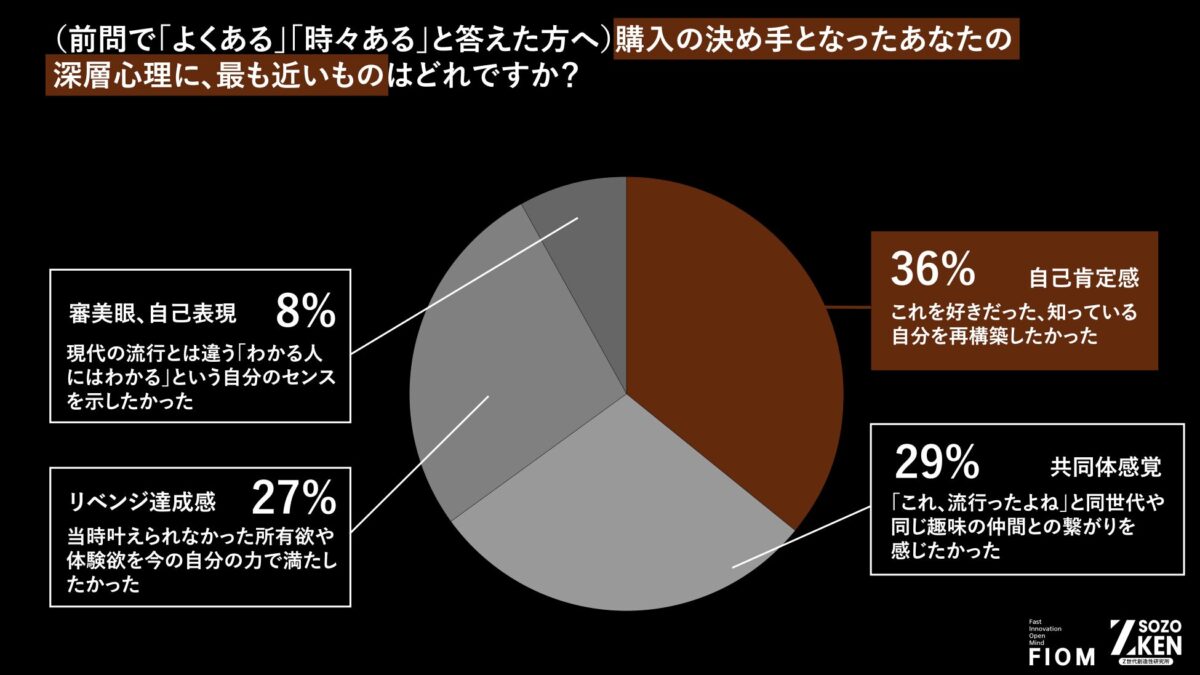 懐かしさをきっかけに商品を購入する最大の決め手は、「これを好きだった、知っている自分を再構築したかった(自己肯定感)」(36%)でした。さらに、「当時叶えられなかった所有欲や体験欲を今の自分の力で満たしたかった(リベンジ達成感)」が27%を占め、大人になったからこその消費行動が浮き彫りになりました。