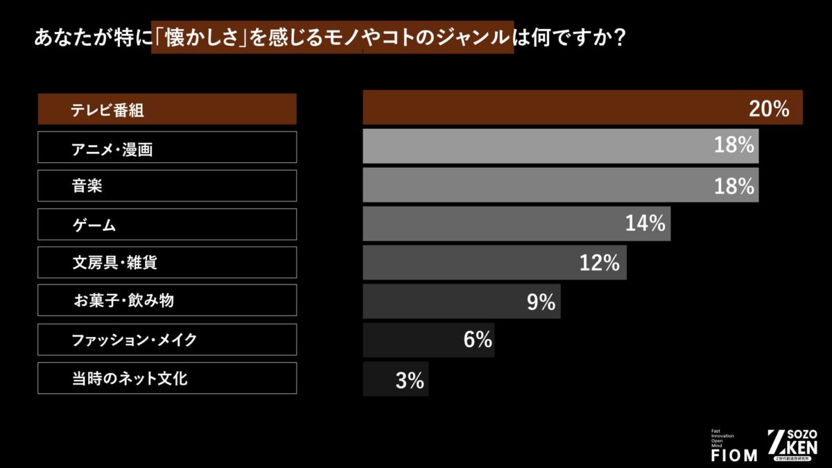 特に「懐かしさ」を感じるジャンルを尋ねたところ、「テレビ番組」(20%)、「アニメ・漫画」(18%)、「ゲーム」(18%)が上位を占めました。デジタルネイティブでありながら、多感な時期に触れたエンターテインメントコンテンツが、彼らのノスタルジーの源泉となっています。