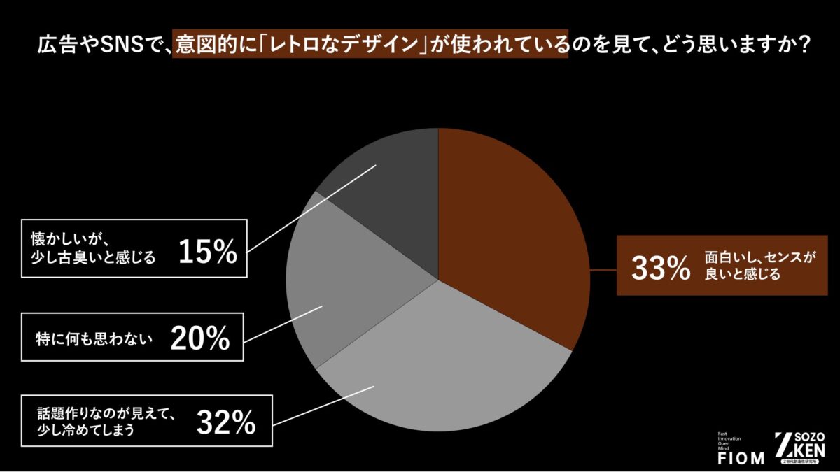 広告やSNSで意図的に「レトロなデザイン」が使用されているのを見た際、「面白いし、センスが良いと感じる」層が33%いる一方で、ほぼ同数の32%が「話題作りなのが見えて、少し冷めてしまう」と回答しており、あざとい演出には厳しい目が向けられています。