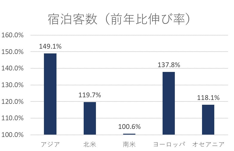 海外からの観光客需要の回復と成長が続いており、外国人による宿泊者数は約14万4千人に到達しました。前年からの増加数は約5万人となり、前年比では151.4%という大幅な伸びを示しています。