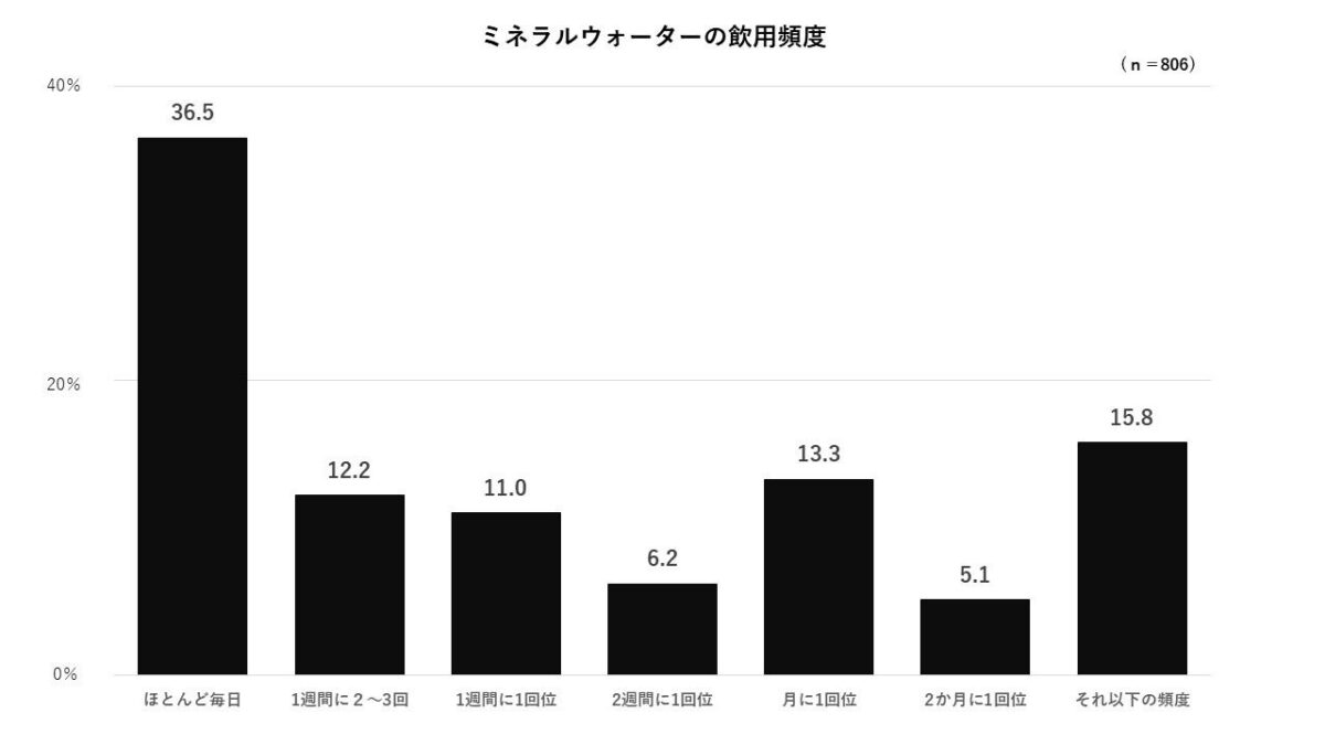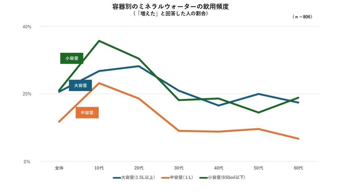 ミネラルウォーターの飲用頻度については、「ほとんど毎日」と回答した人が最も多く、36.5%という結果になりました。容器別の飲用頻度を分析すると、全ての容量において10代から20代の飲用頻度が増加傾向にあり、特に中容量および小容量においてその傾向が顕著に現れています。この結果から、若年層を中心としてパーソナルサイズへの需要が拡大していることが読み取れます。
