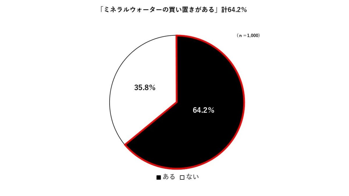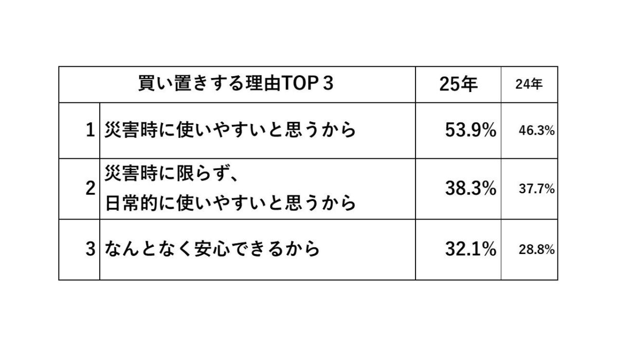 「ミネラルウォーターの買い置きがある」と回答した人は64.2%となりました。その理由としては、「災害時に使いやすいと思うから」が53.9%、「災害時に限らず、日常的に使いやすいと思うから」が38.3%、「なんとなく安心できるから」が32.1%という3項目が上位を占めました。昨年と比較すると、「災害時に使いやすい」「何となく安心できる」という理由が大幅に上昇しており、防災意識の高まりから水の備蓄が一般的になってきていること、また水分補給以外の用途にも水の利用が広がっていることがうかがえます。