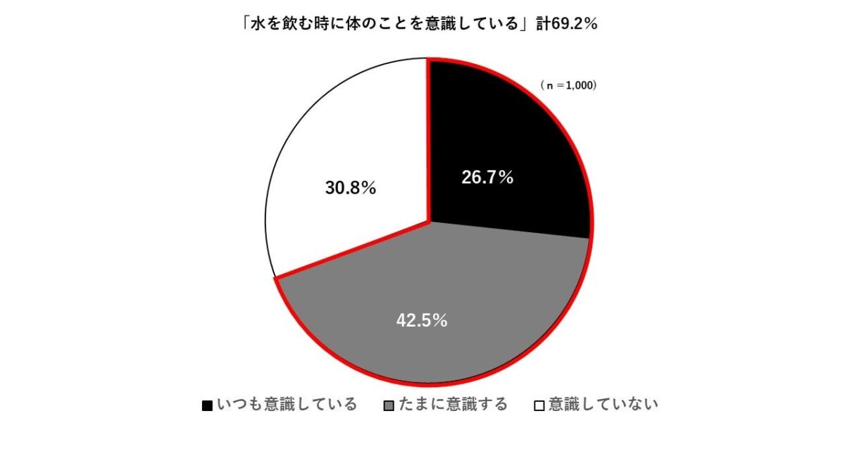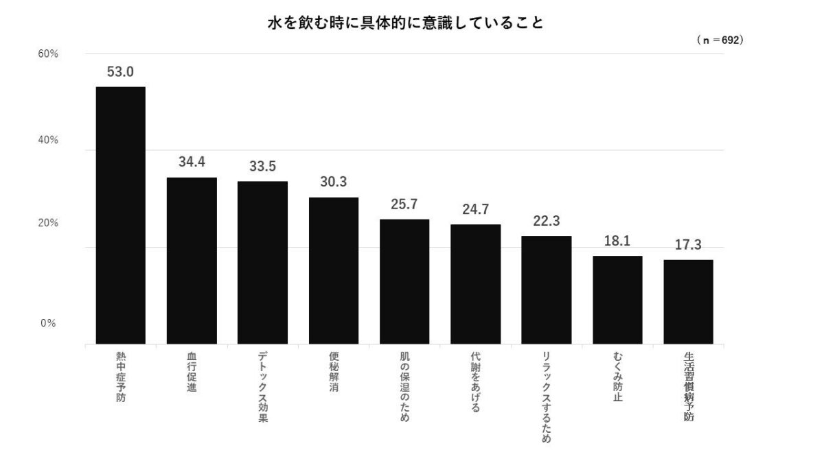 「水を飲む時に体のことを意識している」と回答した人は約7割の69.2%に達しました。具体的な理由としては「熱中症予防」が最も多く挙げられましたが、それ以外にも「デトックス効果」「肌の保湿」などが理由として挙げられています。特に女性においては、水分補給が健康や美容への意識と結びついている傾向が見られました。