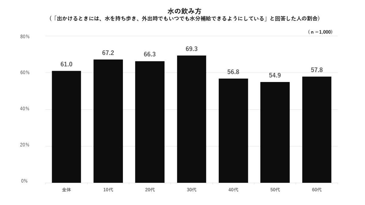 さらに、「出かけるときには、水を持ち歩き、外出時でもいつでも水分補給できるようにしている」と回答した人の割合を見ると、全世代の中でも特に10代から30代のスコアが高く、若年層における飲用水の持ち歩きニーズが非常に高いことが明らかになりました。