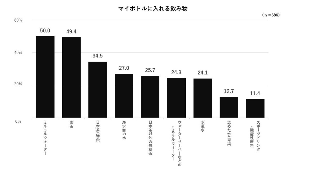 今回の調査では新たにマイボトルの利用状況についても調査を実施したとのことです。その結果、約3割に当たる34.3%が「利用している(ほとんど毎日)」と回答し、「利用している(ごくたまに)」まで含めると約7割に相当する68.6%がマイボトルを利用していることが判明しました。年代別に見ると、10代が86.6%と最も高い利用率を示しています。また、マイボトルに入れる飲み物については「ミネラルウォーター」が50.0%で最多となりました。これは、ミネラルウォーターを好みの容量で、また冷たい状態のまま持ち歩きたいというニーズが存在していることを示唆しています。