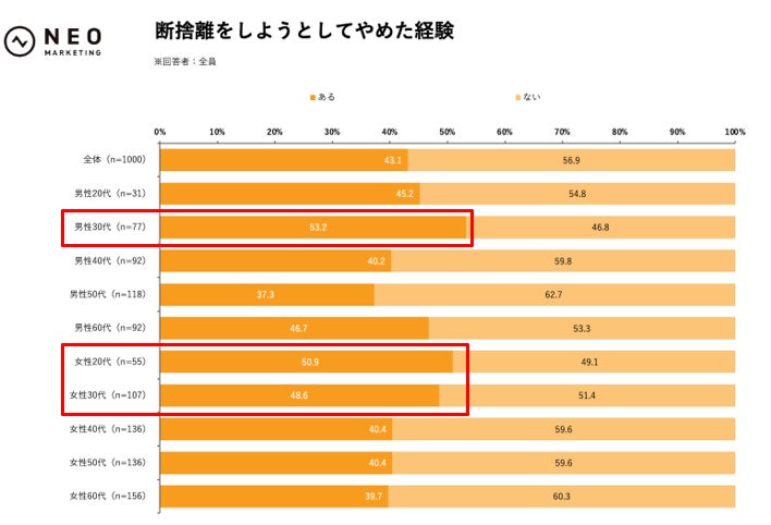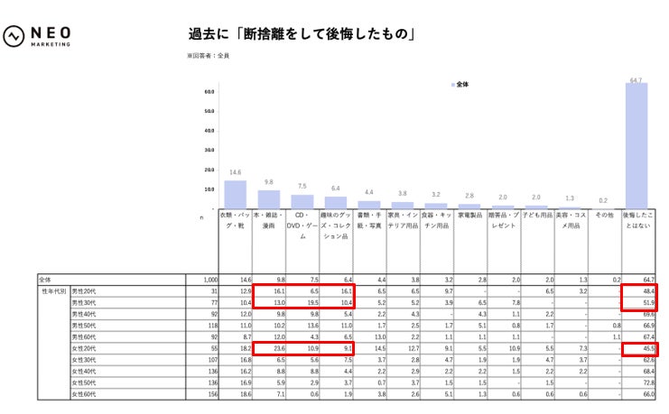 断捨離前に約60%が情報収集を行い、断捨離をしようとしてやめた経験も43.1%に上っていました。こうした"事前に調べる""途中で立ち止まる"慎重さが、結果として後悔の少なさにつながっていると考えられます。