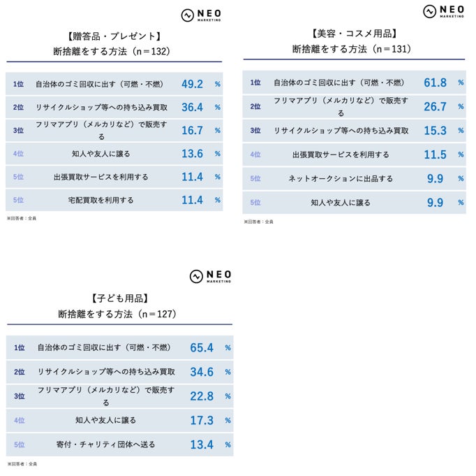 断捨離をする際、どのような方法を利用することが多いかについて質問されました。以下は、各ジャンルのTOP5までをランキング化したものです。