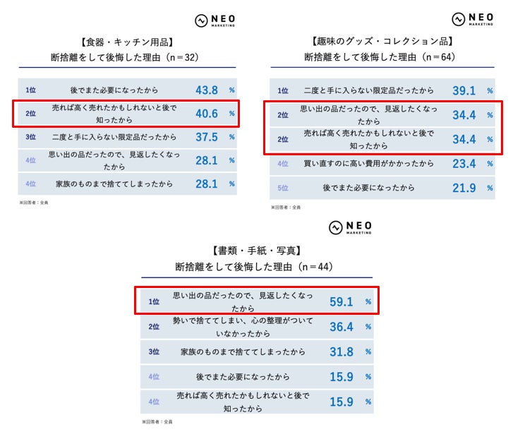 一方、本・雑誌・漫画やCD・DVD・ゲーム、趣味のグッズ・コレクション品、書類・手紙・写真では、「思い出の品だったので、見返したくなったから」が上位に入っています。情報や記録、思い出が残るものほど後悔につながりやすい傾向です。